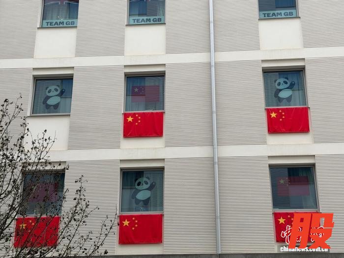当地时间2月3日,在米兰冬奥村,中国体育代表团驻地外悬挂着五星红旗,并布置有熊猫元素。中新社记者 国璇 摄