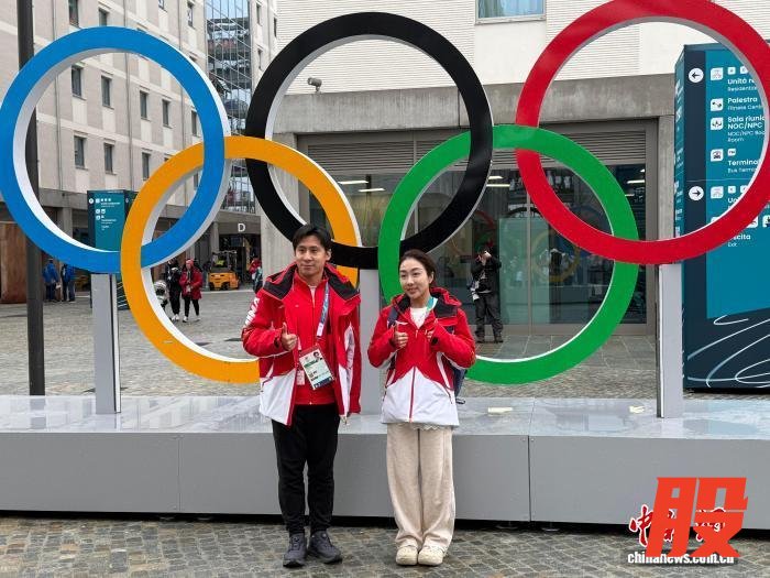 当地时间2月3日,在米兰冬奥村,中国花样滑冰运动员隋文静(右)、韩聪与奥运五环合影。中新社记者 国璇 摄